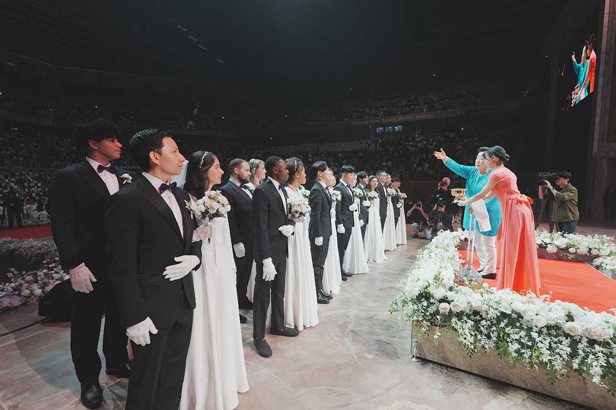 (写真:家庭連合の壮大な祝福結婚式。世界中から集まったカップルたちが平和の誓いを立てる感動シーン)